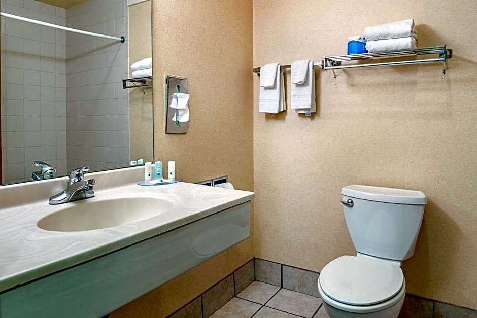 This guestroom includes a roll-in shower and wheelchair access. A flat-screen satellite TV, a small refrigerator and a microwave are provided, as are a hairdryer, coffeemaker and ironing facilities.